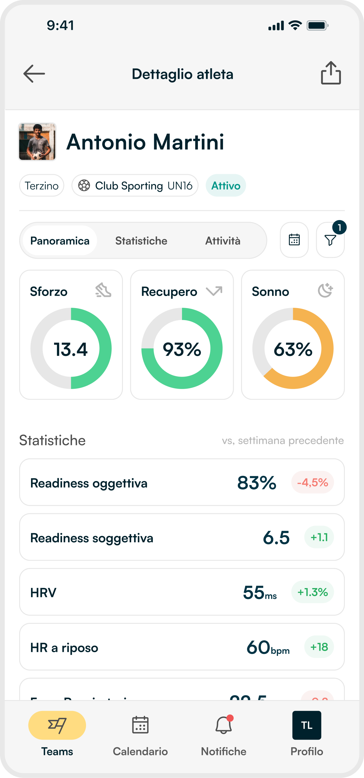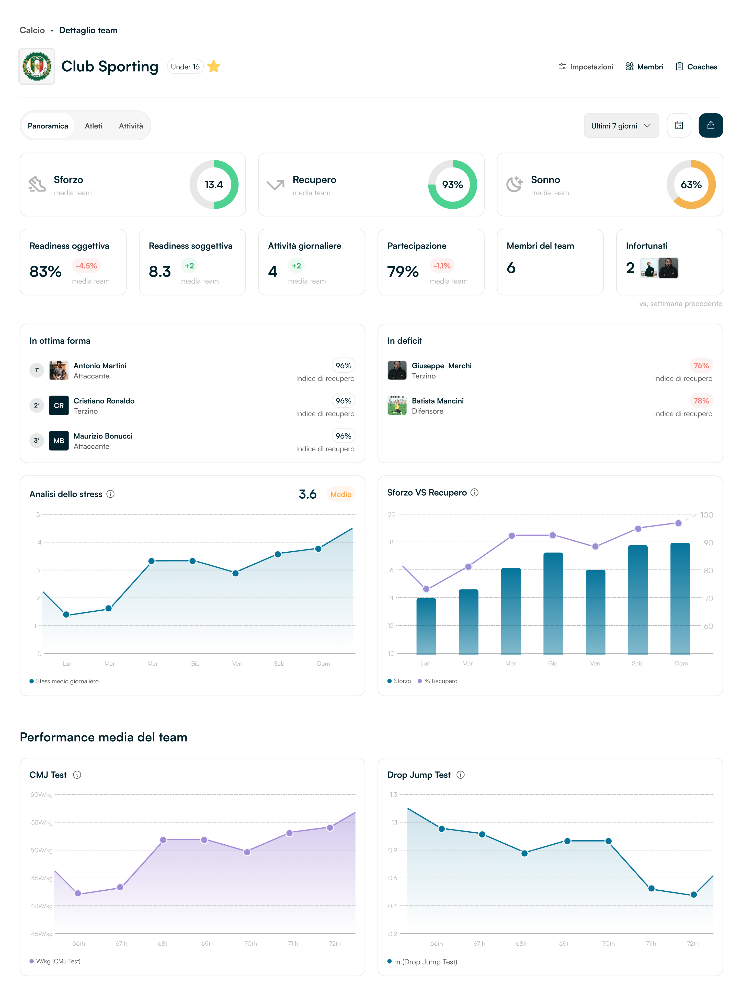 Tieni sotto controllo la readiness del tuo team, i carichi e l'allerta infortuni.